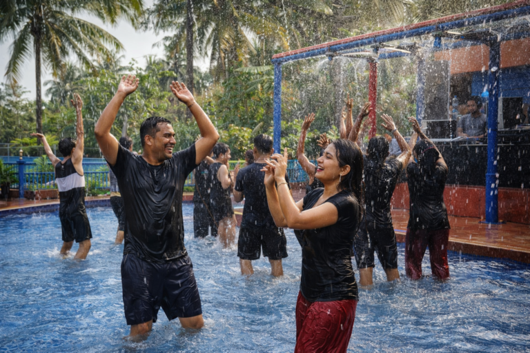 “Enjoy exciting rain dance at Tulsi Beach Resort with music, showers, and fun-filled moments perfect for friends, couples, and families.” 💃🌧️🏝️